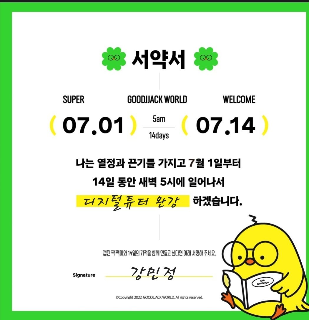 나는 열정과 끈기를 가지고 7월1일부터 14일동안 새벽5시에 일어나서 디지털튜터 자격과정을 완강 하겠습니다