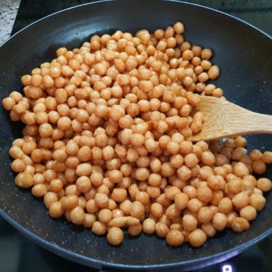 3. 바글바글 끓으면 퍼핑콩(오란다알알이)을 넣고 잘 섞어주세요.
